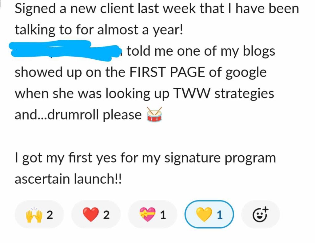I love it for the end to end support: the planning and strategy, the feedback on my work from a marketing genius, the immediate answers to questions that come up for me through Slack plus the more in-depth support on the hot seat calls for mindset and beyond...it is SO GOOD.